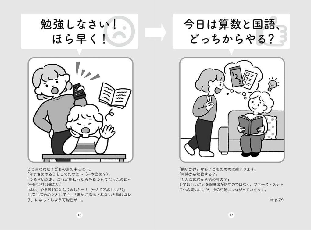 勉強を “教える” のではなく、保護者が “そばにいて支える” コーチングによって「自分でやるしかない」、そして不思議なことに怒られるわけでもないのに「やらなきゃ」と自然に子どもが思うようになる著者開発のプログラムを、おうちで簡単に実践できるよう解説しています。