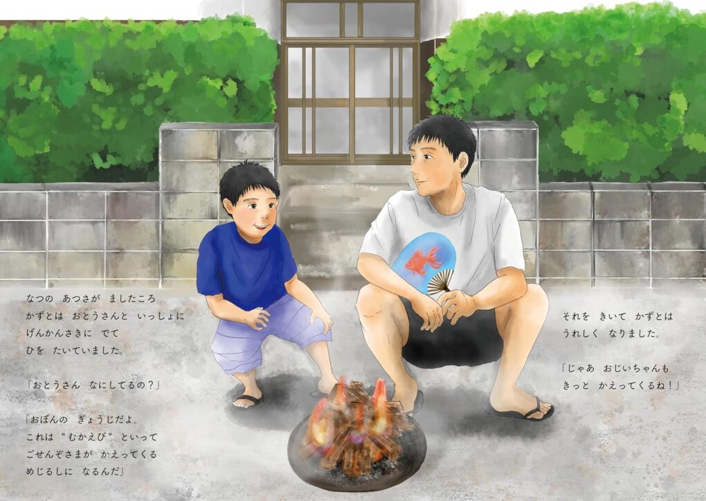 夏のある日、かずとはお父さんといっしょに「むかえ火」を焚きました。