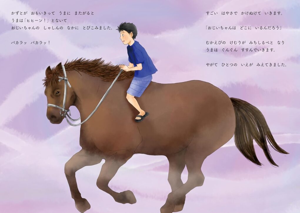 かずとはその背に乗って、おじいちゃんを迎えに出発します。