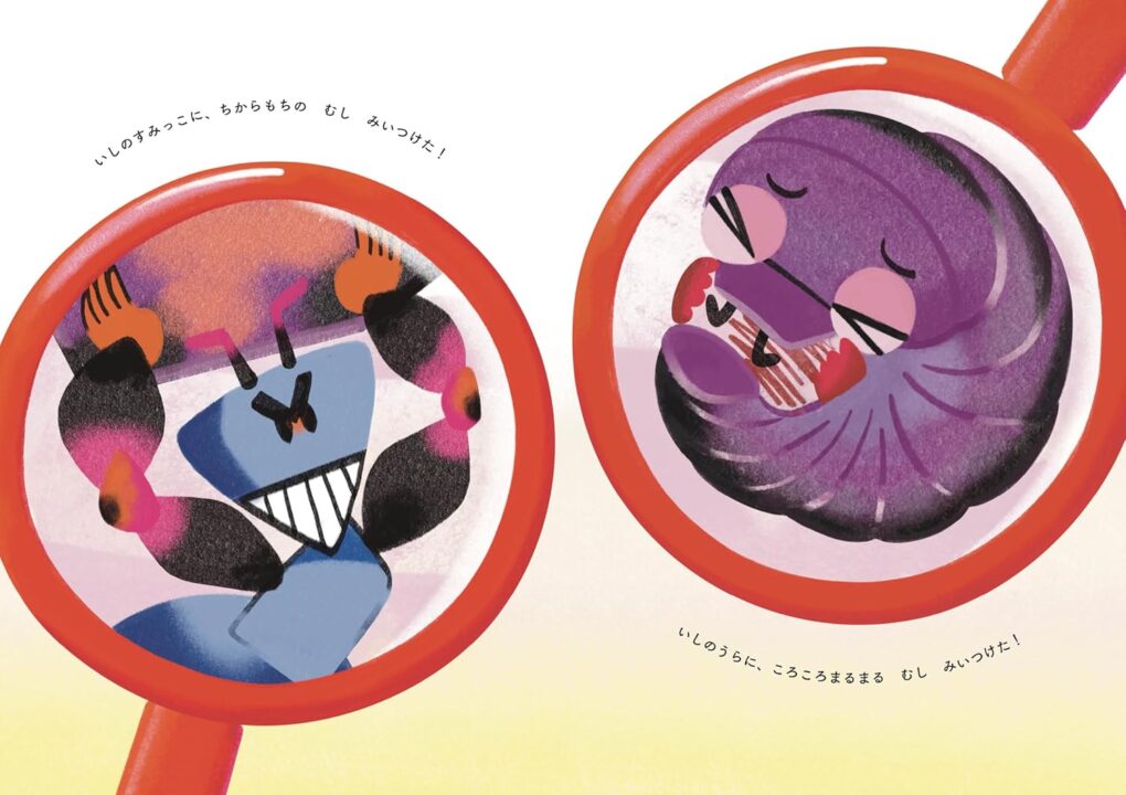 虫めがねというレトロなアイテムを中心に、可愛いキャラクターやジャングルの豊かな自然が色鮮やかに描かれています。