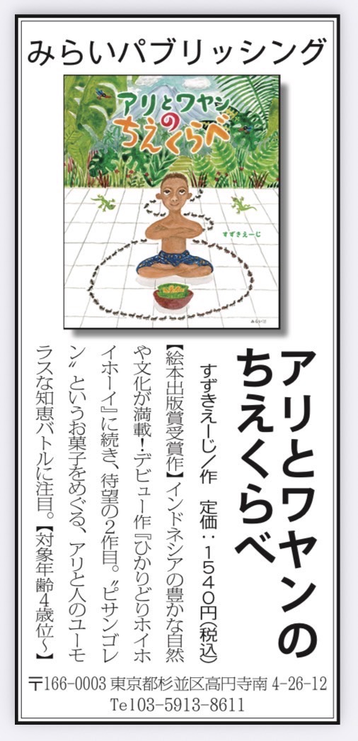 9/18(木)毎日新聞に広告掲載『アリとワヤンのちえくらべ』