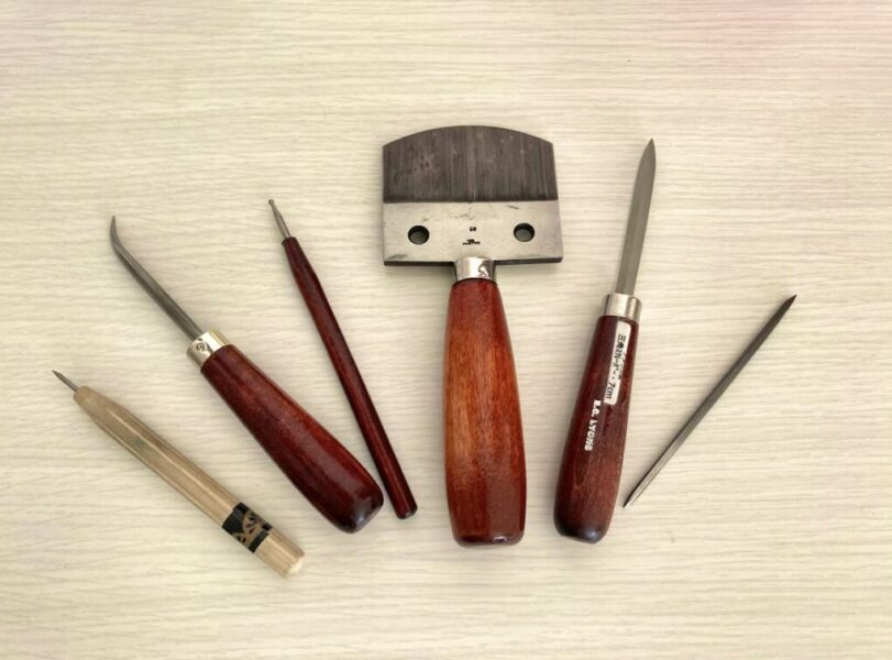 (右からバニッシャー、スクレーパー、ベルソー、バニッシャー、バニッシャー、ニードル)