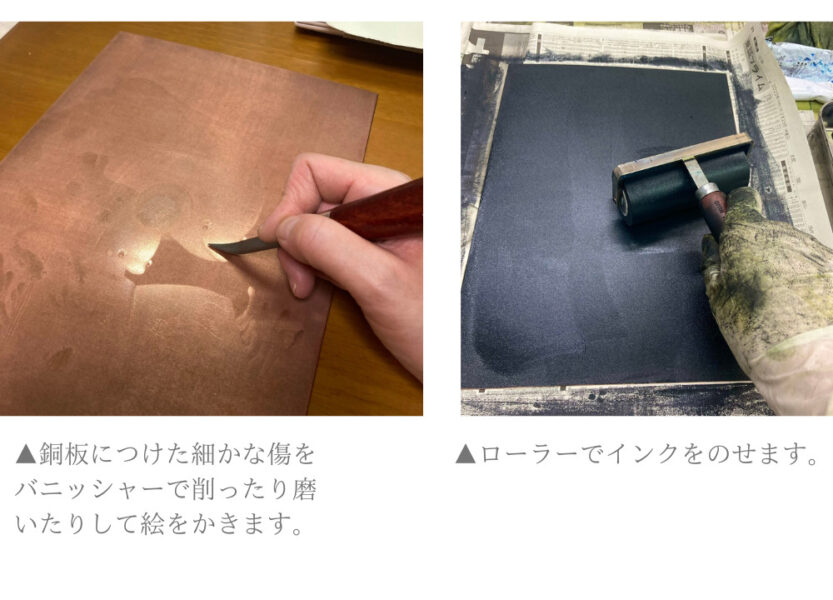 作品全体をつつむ独特の柔らかい雰囲気は、銅版画の「メゾチント」の技法で表現したもの。フランスでは「マニエール・ノワール(黒の技法)」と呼ばれるとおり、黒と白の奥深く豊かなグラデーションの表現に優れています。メゾチントでは、まず、銅板の表面全体に縦横斜めの無数の傷をつけて、その傷にインクを絡ませて黒いキャンバスを作ります。キャンバスについた傷を、バニッシャーという鉄のペン状の道具で削ったり磨いたりして深さを調整して刷り上げることで、白い線や絵を浮き上がらせます。工程に多くの手間と時間と根気を要しますが、こたかさんは「暗がりに明かりが灯っているような、神秘的で静謐な世界をつくりだせる」とその魅力を語ります。