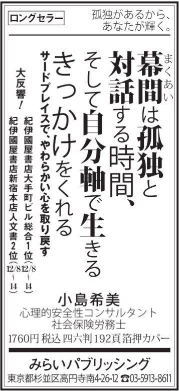 2/6(金)毎日新聞に広告掲載『幕間は孤独と対話する時間、そして自分軸で生きるきっかけをくれる』
