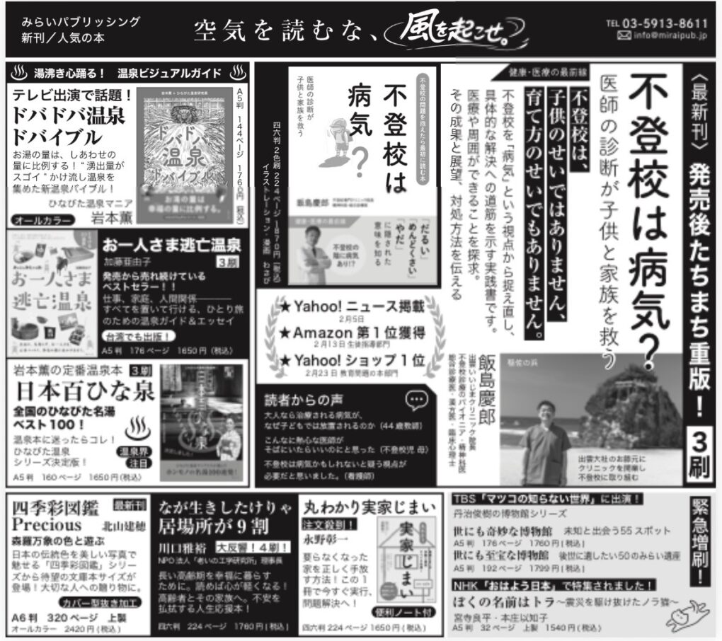 3/4(水)読売新聞に半五段広告掲載『不登校は病気?』ほか