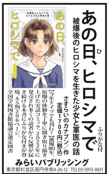 8/6(水)毎日新聞に広告掲載『あの日、ヒロシマで ふりがな付 〜被爆後のヒロシマを生きた少女と軍医の話〜』