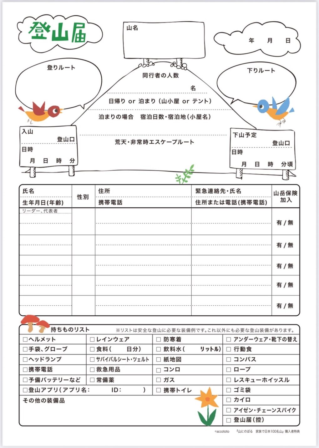 『山にのぼる 家族で日本100名山』 購入者特典 accototoオリジナル登山届 *ダウンロードしてお使いください。 *データの再配布などは禁止です。個人利用の範囲内でお楽しみください。 accototoオリジナル登山届pdf